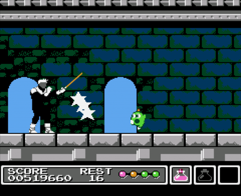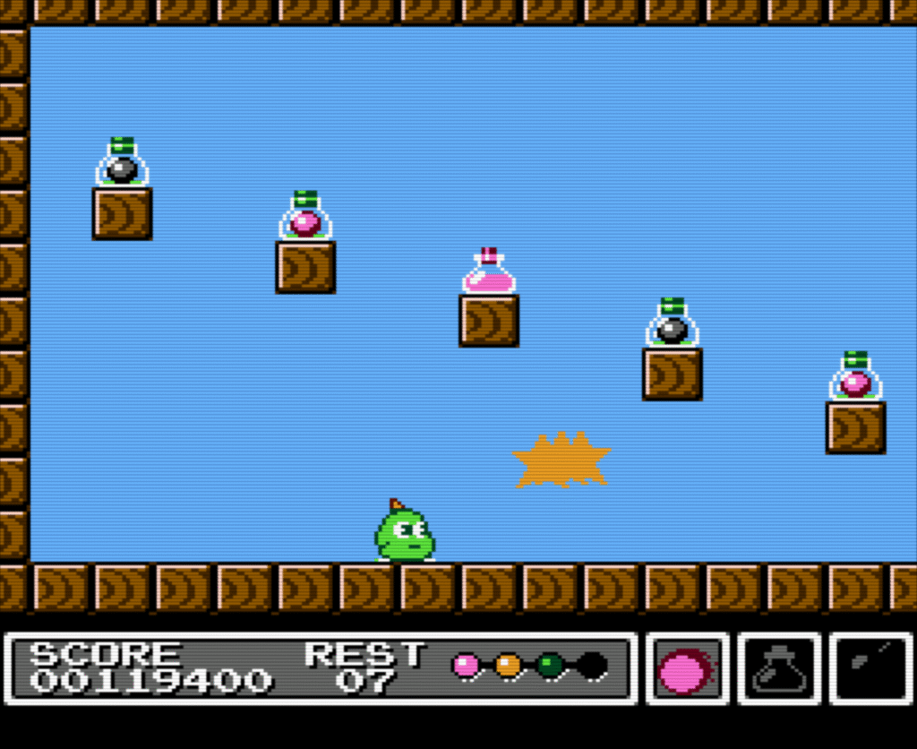 Finalement, j’ai eu raison du dernier boss et j’ai terminé Gimmick! sans mourir! Pour moi, c’est une petite page d’histoire dans ma vie de joueur, et j’en suis tellement satisfait. Il y a tellement de façons de mourir dans ce jeu, le gameplay est tellement serré et “nerveux”, que quand je repense à ma partie sans mourir, j’ai encore du mal à croire que tout s’est déroulé sans anicroches. Je crois que la raison pour laquelle je suis si surpris, c’est que je n’ai pas pratiqué pour le faire sans mourir, c’est venu un peu tout seul, à force de revenir à ce jeu simplement par plaisir et car je l’aime beaucoup.