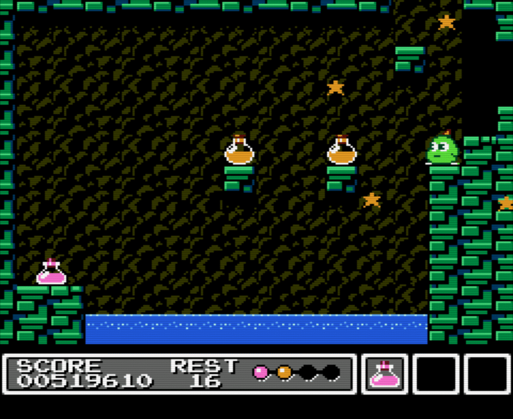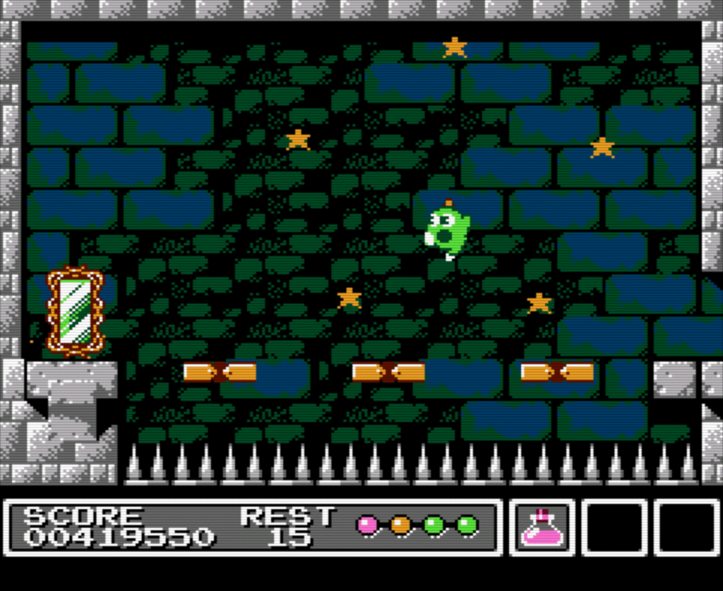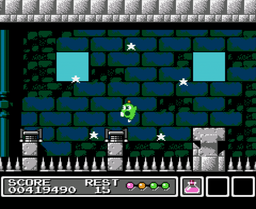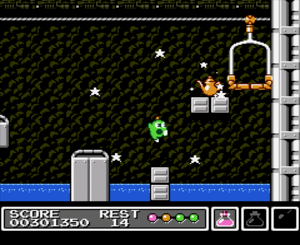 Ce tableau, le cinquième, est l’un des plus difficiles, et celui qui ne me donnait pas envie de tenter ce jeu sans mourir. Il est facile de mourir bêtement et subitement à plusieurs endroits. La séquence pour récupérer le trésor secret est particulièrement stressante. Les plateformes avec les convoyeurs ne sont pas trop mal, mais il faut ensuite réussir un saut rapide sur l’étoile pour atteindre l’objet secret, et même si je meurs rarement là, c’est toujours un mini-stress. C’est aussi ce que j’aime dans Gimmick! : son platforming serré et rapide, qui ne doit jamais être pris pour acquis.