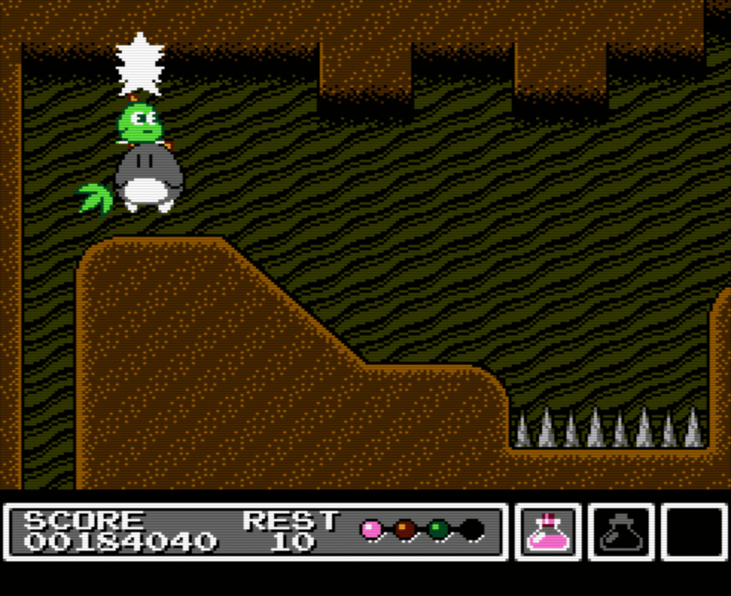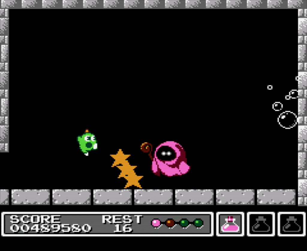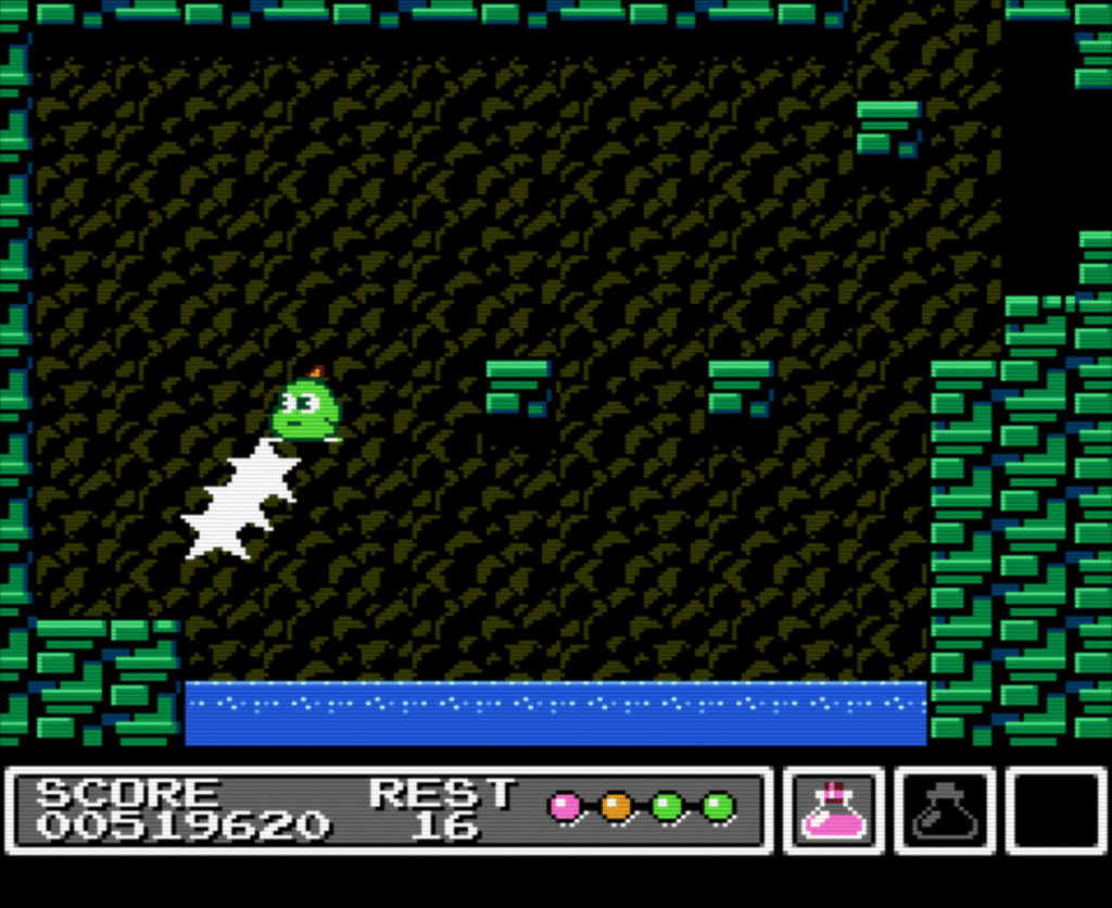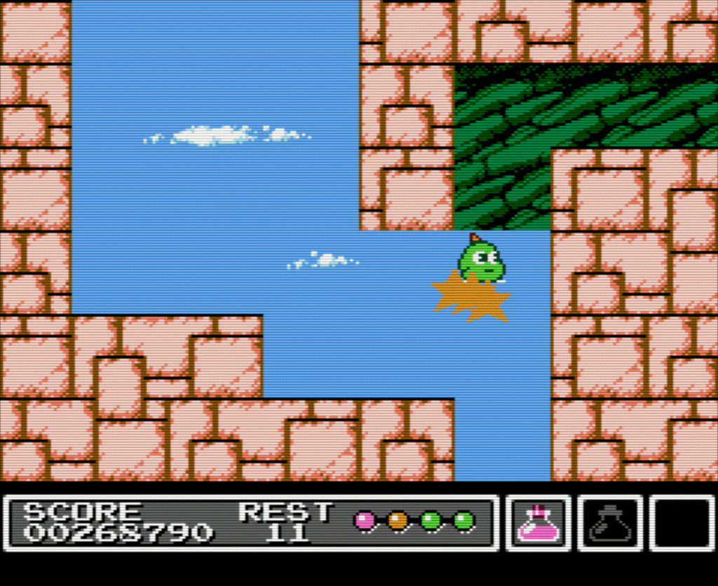Ce tableau, le cinquième, est l’un des plus difficiles, et celui qui ne me donnait pas envie de tenter ce jeu sans mourir. Il est facile de mourir bêtement et subitement à plusieurs endroits. La séquence pour récupérer le trésor secret est particulièrement stressante. Les plateformes avec les convoyeurs ne sont pas trop mal, mais il faut ensuite réussir un saut rapide sur l’étoile pour atteindre l’objet secret, et même si je meurs rarement là, c’est toujours un mini-stress. C’est aussi ce que j’aime dans Gimmick! : son platforming serré et rapide, qui ne doit jamais être pris pour acquis.