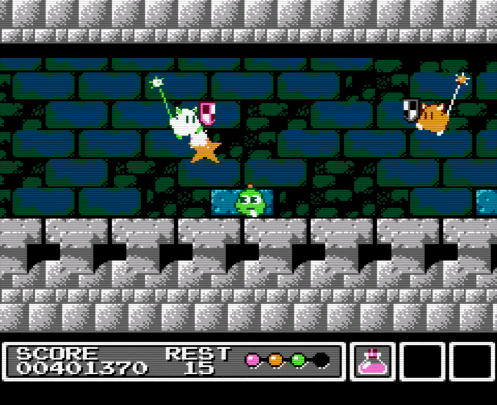 Le troisième tableau n’est pas bien stressant. Avant, j’ignorais ce “mini-boss” nommé Ponta, mais récemment, je trouve que c’est tout aussi facile de le tuer en se plaçant sur sa tête. Il donne une potion qui ajoute un point de vie à Yumetaro pour la durée du tableau, et en se plaçant sur sa tête, il est facile à éliminer sans problème. J’ai donc décidé de le faire, car comme je disais, je ne voulais pas couper les coins ronds. Pas me compliquer la vie inutilement, mais pas non plus sauter des étapes. Je voulais faire le jeu à ma façon et du mieux possible, tant qu’à faire.