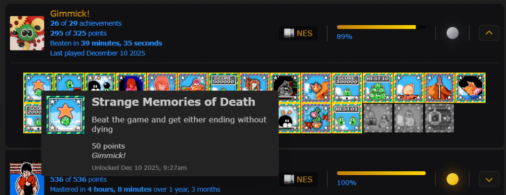 EDIT : Nous sommes quelques heures plus tard, et j’ai décidé de terminer les derniers succès qui me manquaient pour obtenir le master sur RetroAchievements. Il m’en manquait trois.