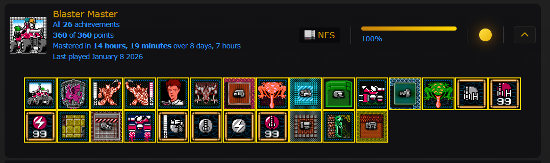Ouff! Au moment d’écrire ces lignes, je viens tout juste de terminer Blaster Master sans mourir. J’ai aussi débloqué tous les succès sur RetroAchivements pour ce dernier. C’est un de mes jeux NES préférés, mais vu sa longueur (environ une heure trente quand on sait où aller), je n’ai jamais considéré viser un 1LC pour ce dernier. Cependant, je me souviens l’avoir fait en 1CC, et comme le jeu ne nous donne que deux vies, dans un sens, un 1CC n’est pas bien loin d’un 1LC. Mais pour ce faire, il faut que tout aille bien. Une fois qu’on connait bien le jeu, on ne meurt presque plus, mais le 8e monde est toujours où j’avais des problèmes. J’ai pensé partager avec vous quelques conseils et anecdotes, dont certains que je n’ai pas vus mentionnés en ligne. Je ne vais pas parler du “pause trick”, qui est bien connu, mais plutôt de quelques détails, s’adressant avant tout à un joueur qui connait déjà passablement bien le jeu. Nous allons spécifiquement analyser le 8e monde pièce par pièce, car c’est vraiment ce dernier qui cause problème, autant dans une partie 1CC que 1LC.